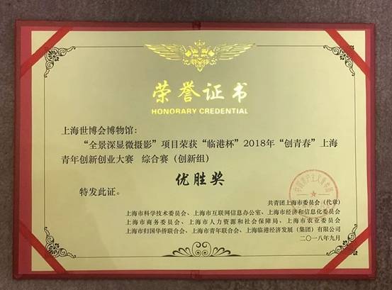 上海世博会博物馆WE创新工作室的《全景深显微摄影》项目荣获2018年“创青春”上海市青年创新创业大赛创新组综合赛的优胜奖! ![]()