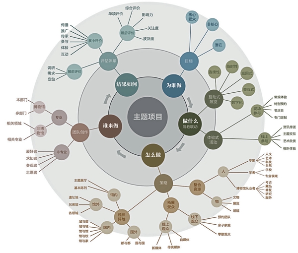 一个好的展览评估体系有助于衡量博物馆教育的效果。展览评估体系不只是对展览后的评估,而是包括展览前的调研、展览中的执行、展览后的评估在内的一个完整体系。这种展览评估体系融入了思维导图的思想,使博物馆教育在确保观众观展的同时,激发他们的探索欲以进行深层次的学习,培养观展者再次走进博物馆的兴趣。