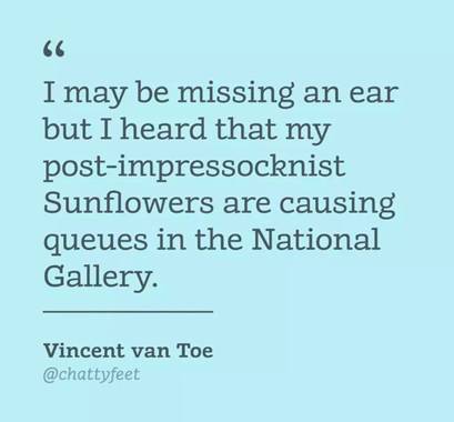 「也许我少了只耳朵,但我听说来看我的‘后袜子印象派’向日葵的人在国家美术馆排起长队了。」