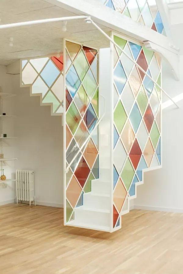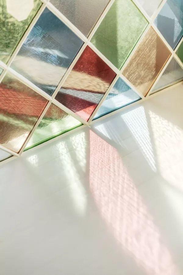 钻石的图案与木构框架的几何形状相一致,原始木材的纹理,白色的画布感觉与彩色玻璃相互映衬,有一种艺术创作的感觉。