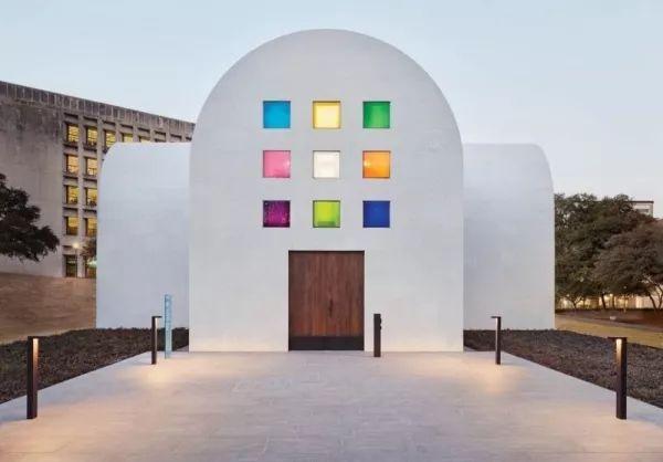 凯利以其鲜明的色彩运用、对图腾雕塑的喜爱和对几何形状的热爱而闻名,他用白色石头设计了这栋建筑的外部,并在建筑的正面周围用彩色玻璃窗组合成图案。这种彩色玻璃模仿传统天主教堂的彩色玻璃窗,并在里面产生有趣的斑点光效果。这是艺术家第一次用玻璃渲染色彩,创造了一个空灵、令人难忘的空间。尽管有这些显而易见的宗教设计参考,凯利希望教堂保持世俗,拒绝接受宗教教堂的资助,以保持其愿景,保留了艺术的纯粹性。