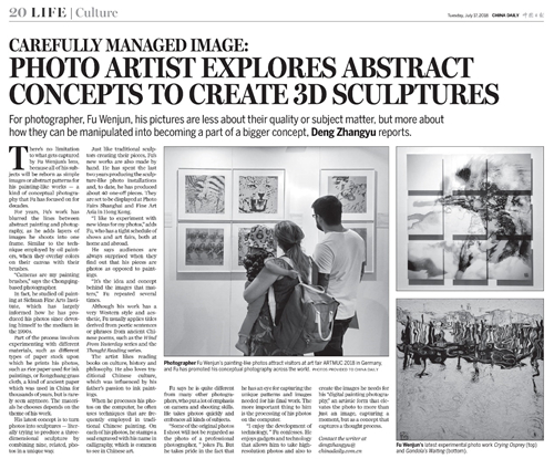 就像传统的雕塑家创造他们的作品一样,傅文俊的新作品也是手工制作的。过去两年他一直在制作雕塑般的摄影作品,到目前为止,他已经制作了大约40件独版的作品。它们将在上海艺术影像展和香港的典亚艺博上展出。