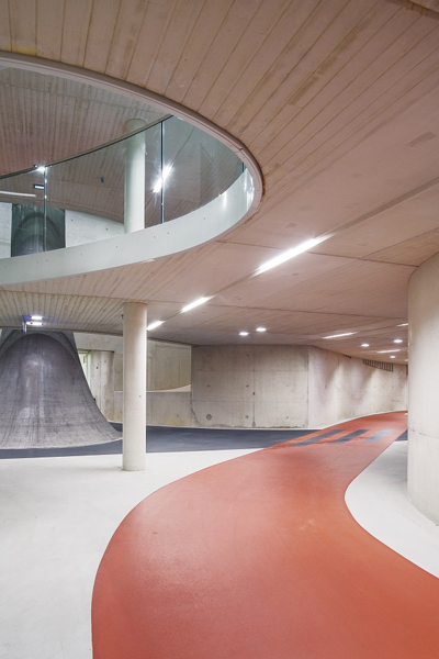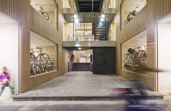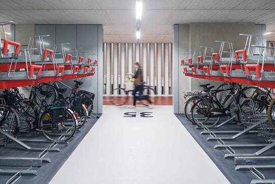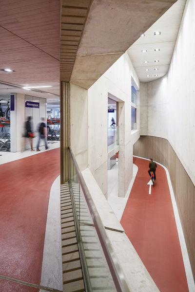 车库的设计以便利性、速度和安全性为目标。车库内设置了红色的专用行车道,人们可以从城市一直骑车到车库内的车位旁。通过电子信号提示,你可以清楚地知道哪个区域有剩余车位。