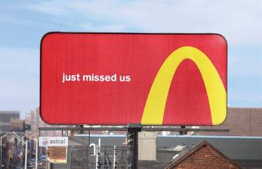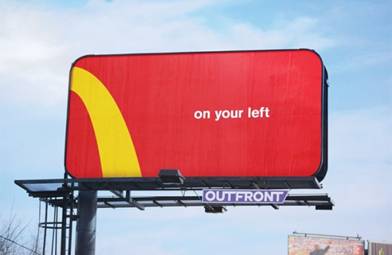 像这样的红黄相间的麦当劳的路牌,在单调的公路上显得引人注目,格外时尚,还透着点幽默和俏皮。不但传播了麦当劳的品牌文化,合理地营销,培养客户,还成为公共空间的一件流行艺术品。