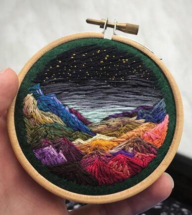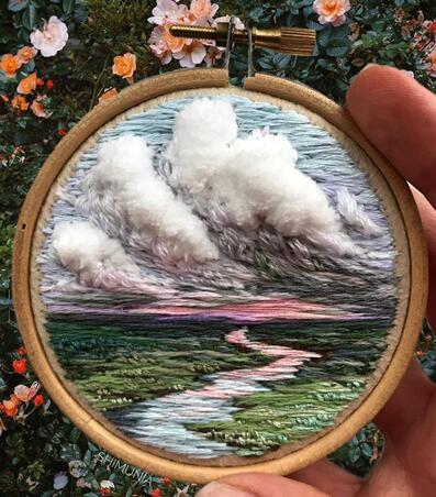 shimunia把一系列不同颜色的针线缝在一起,构成了美丽的风景图案,并把它们套在了手掌大的绣花撑子里。她使用的缝线风格各异、纹理不一,包括粗的细的、甚至是3D纤维。