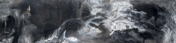 行至后段,第三展厅、第四展厅中,画幅骤然变大,笔触也越来越趋向于抽象。沈伟提醒大家“需要很安静地去看”。几幅画乍看如泼墨景色或青绿山水,是沈伟最近在巴黎画室所作,“这些画是心境的影像,表现的是精神世界。”