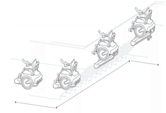 为了保证轮椅攀爬时的平稳,设计师在其内部安装了传感器。每当轮椅上升高度发生变化,传感器就会自动感应,并改变轮椅的重心,使其一直处于水平位置,防止人们摔落。