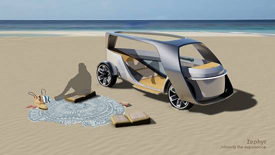 stavros mavrakis近日设计了一款共享用途的可持续无人驾驶汽车,希望借此为旅途中的使用者提供原汁原味、独一无二的当地体验。这款名为zephyr的车对传统汽车设计提出挑战,可视作一座移动的建筑而不仅仅是一款交通工具,同时还能提供灵活短暂的生活空间,使其成为整个实验性冒险活动中的关键部分。