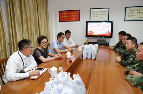 “八一”建军节前夕,恰逢连续高温,世博会博物馆党总支书记蒋莎一行代表世博馆冒着高温,带着浓浓的军民鱼水情,来到消防中队驻地,以座谈的方式慰问了奋战在高温酷暑下的消防官兵们。