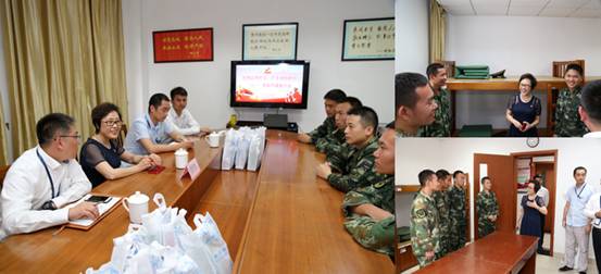 “八一”建军节前夕,恰逢连续高温,世博会博物馆党总支书记蒋莎一行代表世博馆冒着高温,带着浓浓的军民鱼水情,来到消防中队驻地,以座谈的方式慰问了奋战在高温酷暑下的消防官兵们。