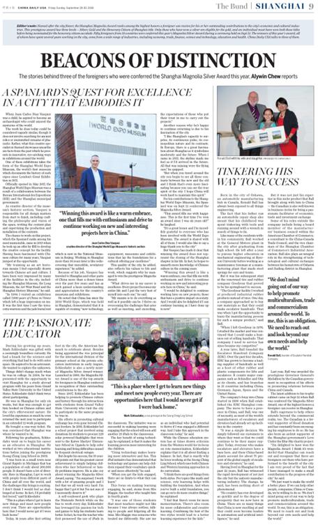 ¡¡¡¡Editor¡¯s note: Named after the city flower, the Shanghai Magnolia Award ranks among the highest honors a foreigner can receive for his or her outstanding contributions to the city¡¯s economic and cultural industries. This prestigious award has three levels ¨C Silver, Gold and the Honorary Citizen of Shanghai title. Only those who have won a silver are eligible for the gold, and an individual must have won both these titles before being nominated for the honorary citizen accolade. Fifty foreigners from 19 countries were conferred this year¡¯s Magnolia Silver Award during a ceremony held on Sept 12. The winners of this year¡¯s award, all of whom have spent several years working in the city, come from a wide range of industries, including economy, trade, finance, science and technology, education and health. China Daily USA talks to three of them.