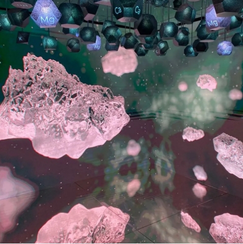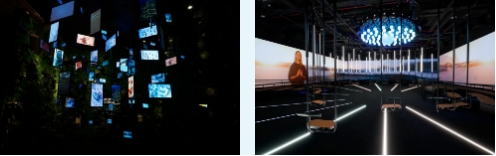同样响应参展主题的还有沉浸式、多层次的音频装置空间——Choral Space,能将声音转化为一个活灵活现的“音频景观”。隐藏在墙壁、天花板和地板中的多个扬声器配合分层的音轨,让访客在不同角度听到的音乐都是独一无二的。复杂且有创意的算法编排还能让音乐同时影响人工智能诗歌的文字外观,使它们相互作用。