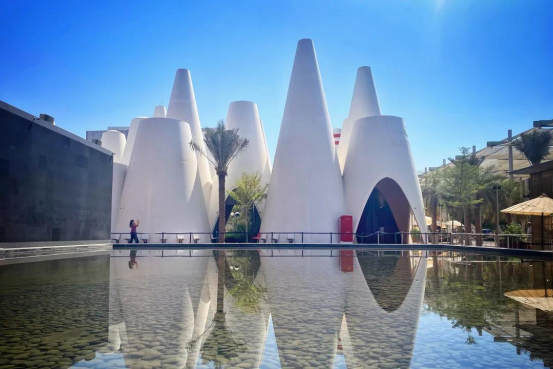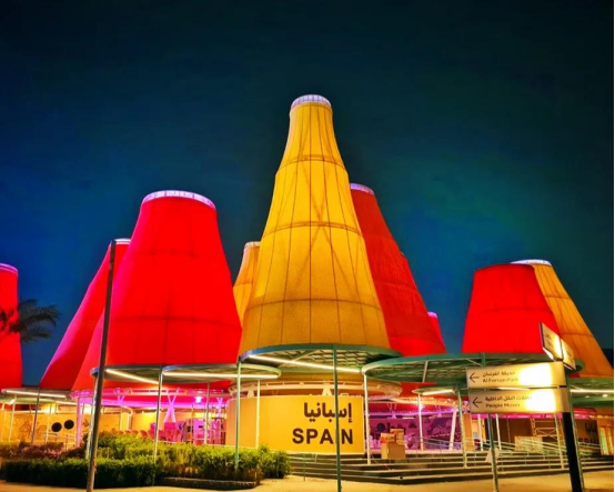 高耸的彩色圆锥结合西班牙本土创意和阿联酋的沙漠色彩在骄阳的照射下熠熠生辉。锥形的建筑结构可以促使空气流通,把周边的高温空气从顶部降温后缓慢下沉到底部,用节能环保的方式为馆内游客带来清凉,让来访者享受到自然和色彩的双重体验。