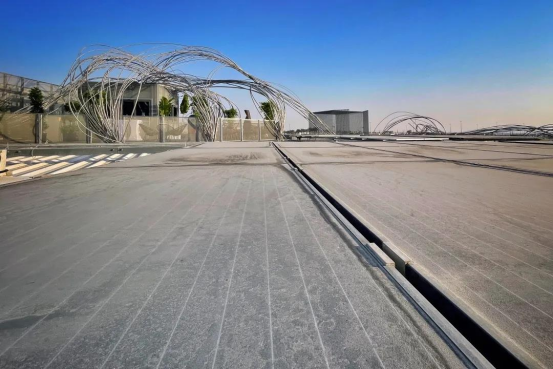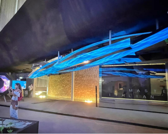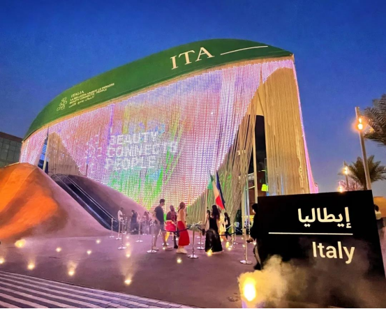 当你在空中俯视迪拜世博会时,可以发现在众多创意十足的展馆中意大利国旗正平铺在Al Forsan公园旁,这就是意大利馆。该馆使用的大部分材料都是回收材料所制成的,包括顶部的国旗也是由天然着色剂渲染而成。