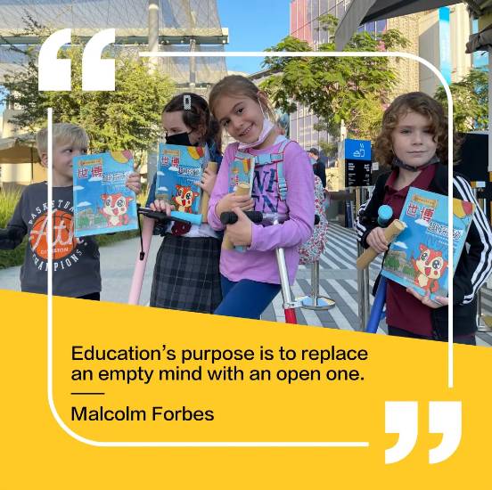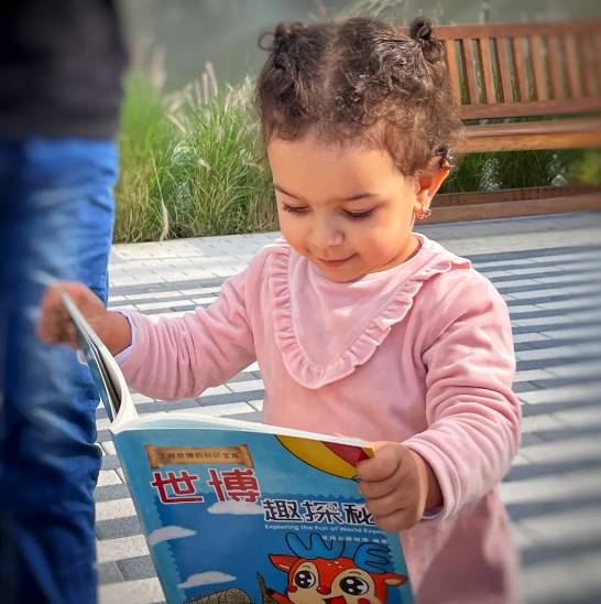 和迪拜世博园区的小朋友一起阅读世博会博物馆WE Kids 儿童双语漫画读物《世博趣探秘》。
