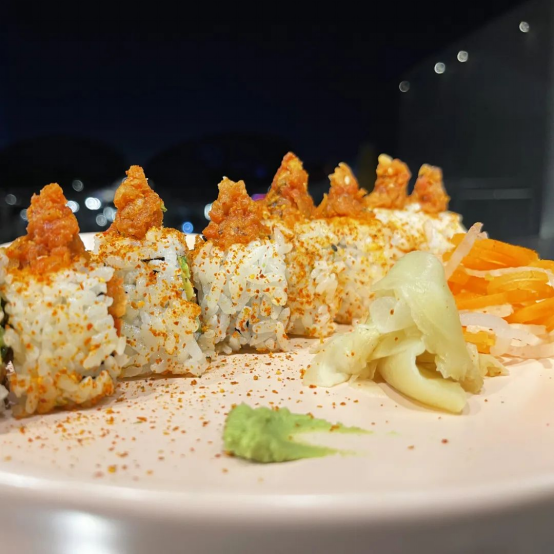 辣金枪鱼寿司配辣椒、鳄梨、番茄和土豆