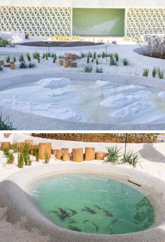 在被由3D打印技术制成的墙壁所包围的花园里,你会发现在盐水中茁壮成长的植物:盐角藻,红树林,微藻和海草。游客们得以欣赏这些植物的独特之美。