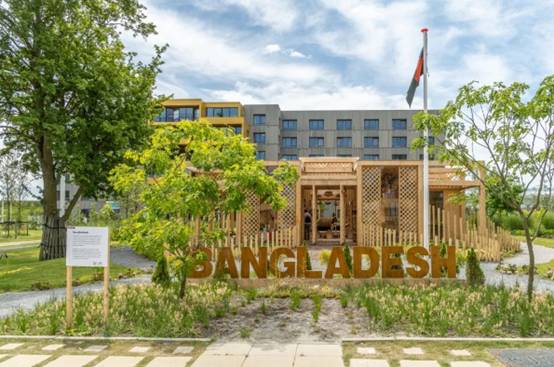 孟加拉国的展馆是关于该国的国花shapla的。你可能更熟悉另一个名字——睡莲。场馆由椭圆形结构组成,寓意的是睡莲的形状。