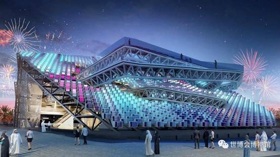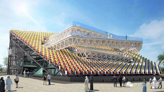 韩国馆突出了“内外不分、无限延展”的设计理念,不仅让展馆入口大开,而且通过展馆内外延伸的螺旋形斜坡游线延展了观展的流畅性,使得展线拉长并延伸至馆外,给人一种新奇和清新的感觉。这些象征沙漠之花的旋转立方体让整个北外立面看上去像一个巨大屏幕,通过旋转立方体色彩和影像的不断变化,传递出活力四射的韩国精彩。