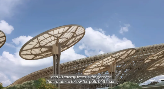 设计团队巧妙的将整个屋顶结构设置大型光伏面板,能在白天大量吸取日光转换为能量源,还能为植物提供遮荫,简直一举两得。