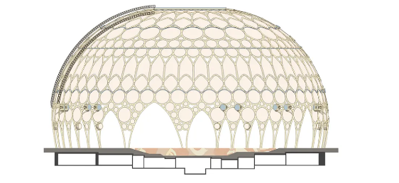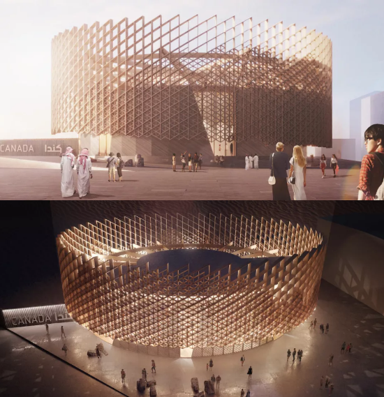 整个场馆占地1300+平方米,灵感来源于乐器——鼓,采用圆形状木质结构,结合中东传统窗花和加拿大风格,形成一场沉浸式美妙夜间盛景!