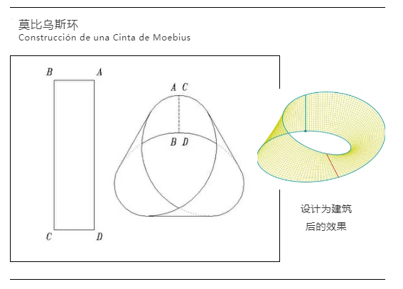 灵感来源于德国数学家莫比乌斯所创作的同名数学图形,延展设计成的拓扑学结构。这种设计的亮点在于用一根长条纸张,旋转半圈,再讲首尾合并,形成一个曲线多个表面的图形,也被称为莫比乌斯环。
