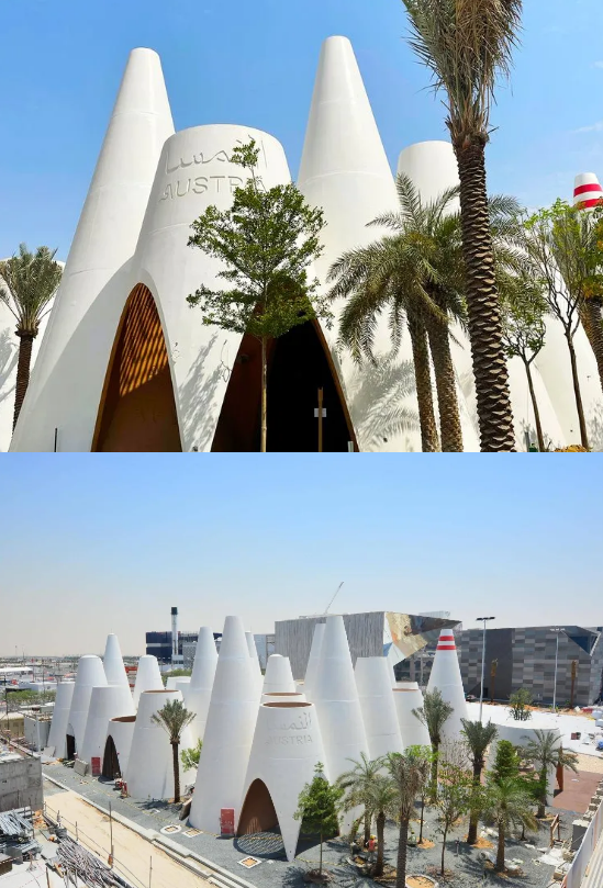 由Querkraft设计团队创造出的38座圆锥形建筑,从外观上看像是一群大小不同的保龄球,其灵感来自阿拉伯本土风塔。在内部,整个馆内能自由通行,合并为一个共同的展览空间,并策划近100多项文化活动将在内部经验上演。