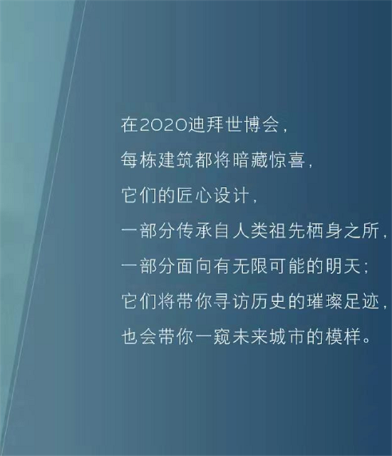 在2020年迪拜世博会,每栋建筑都将暗藏惊喜,它们的匠心设计,一部分传承自人类祖先栖身之所,一部分面向有无限可能的明天;它们将带你寻访历史的璀璨足迹,也会带你一窥未来城市的模样。