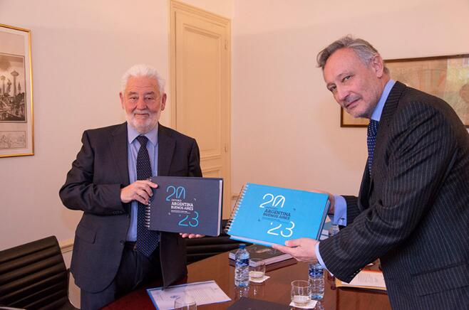 国际展览局秘书长洛塞泰斯从阿根廷驻法国大使的手中接过2023年布宜诺斯艾利斯世博会的认可申请报告。