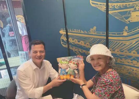 北京世园会中国馆副馆长胡凡向“世博奶奶”赠送纪念品