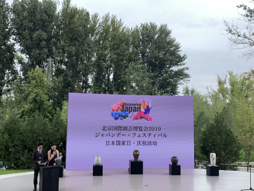 9月12日,2019年中国北京世界园艺博览会“日本国家日”活动在园区妫汭剧场举行开幕仪式。中国贸促会副会长张慎峰、日本驻华大使馆公使石月英雄、日本农林水产省官房生产振兴审议官铃木良典等出席开幕式并致辞。