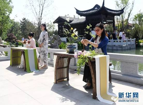 工作人员在北京世园会江苏园内展示插花技艺(6月2日摄)