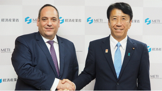 国际展览局(BIE)秘书长迪米特里·S·科肯特斯(Dimitri S. Kerkentzes)与日本经济产业大臣斋藤健(Ken Saito)在东京。(图片来源:BIE官网)