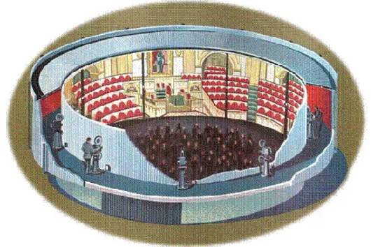 电视的出现让整个电影市场也产生了良性的竞争,陆续出现了环幕、球幕等不同的观影形式。而最早的环幕在1900年巴黎世博会上已经出现了,1958年布鲁塞尔世博上还出现了不同形式的迪士尼环幕。