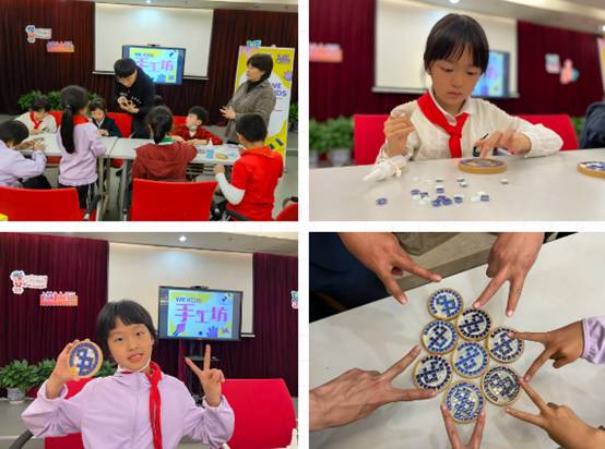 WE Kids教育活动中,将手工坊带进社区,学生们利用杯垫和彩色水晶进行马赛克镶嵌,大家分别制作了属于自己的手工作品。