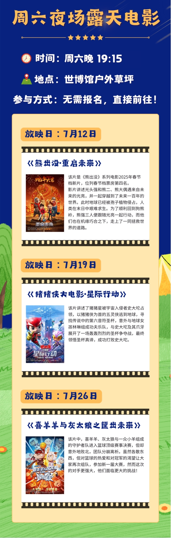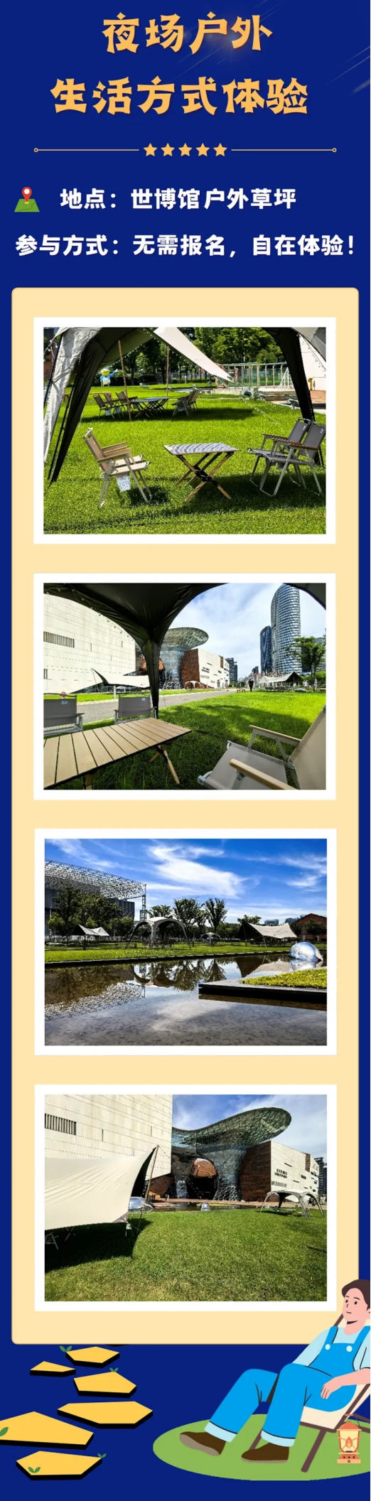 自7月12日起,7月的每个周六,世博会博物馆将延迟闭馆,并举办形式多样的活动,如“希腊人”展览导赏、露天电影、户外露营等,都在等你一起欢乐一夏!