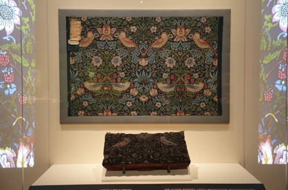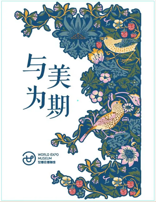 “与美为期:威廉·莫里斯与英国工艺美术运动”的海报主要元素选取的是威廉·莫里斯设计的“草莓小偷”家居纺织品图案。