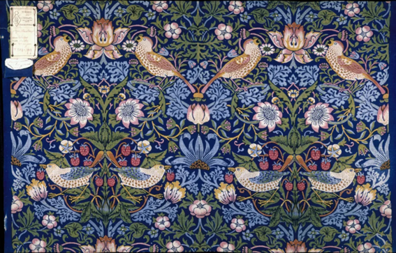 灵感来自他在牛津郡凯尔姆斯科特庄园生活时所见,那里的花园里常有几只画眉鸟来偷吃草莓。图案中的藤蔓、卷草、缠枝和画眉等都呈对称分布,枝蔓、叶子、花朵穿插排列在深蓝底色上,呈现出对比强烈、色彩鲜艳的装饰效果。整个画面生机勃勃,意趣盎然。密集的构图形式、清新的植物元素、生动的绘画线条、古典浪漫的色彩造就了莫里斯装饰纹样设计的独特风格,也就是今天以他名字命名的“莫里斯风格”。