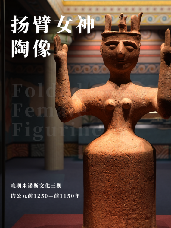 这尊大型陶像内部中空,女神头部所戴王冠装饰特殊。冠冕上三个叉状条纹,两个舌状元素和一只鸟,被专家解读为代表神圣的符号,推测神像头部的开口可以安上头冠或放置鲜花,这尊神像被认为是自然女神本人的形象,或者是女祭司留下的她们在圣地服务的纪念物。雕像所展现的扬臂姿态,可能与女祭司在祭祀活动中的舞蹈动作相呼应。