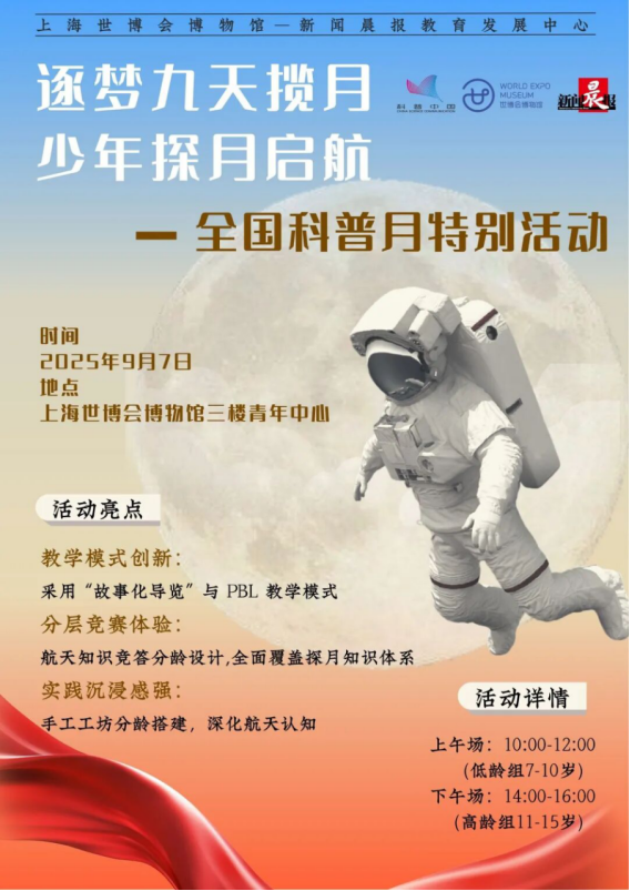 世博馆携手新闻晨报,融合“九天揽月”临览核心意象与青少年探索精神,呼应国家探月工程20年成就,突出“启航”的成长寓意,激发青少年对航天事业的向往与追求。