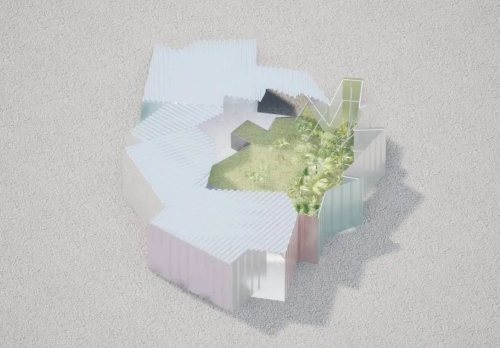 透明的建筑主体是由3D打印树脂板制成的,用弯曲的面板覆盖从而可以反射周围的光线,呈现美轮美奂的光学效果。设计师意图创造一种可以表达人与自然环境互动感,光可以在建筑物之间穿梭,就像一枚透镜般澄澈清亮。当本届世博会结束之后,树脂板将被粉碎并重新加工并重新利用。