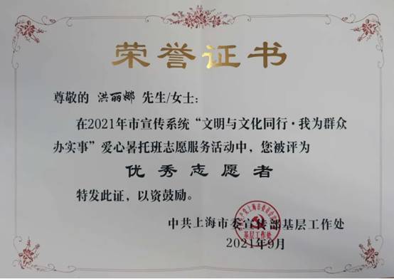 2021年9月,世博馆洪丽娜同志在2021年市宣传系统“文明与文化同行·我为群众办实事”爱心暑托班志愿服务活动中,被评为“优秀志愿者”。
