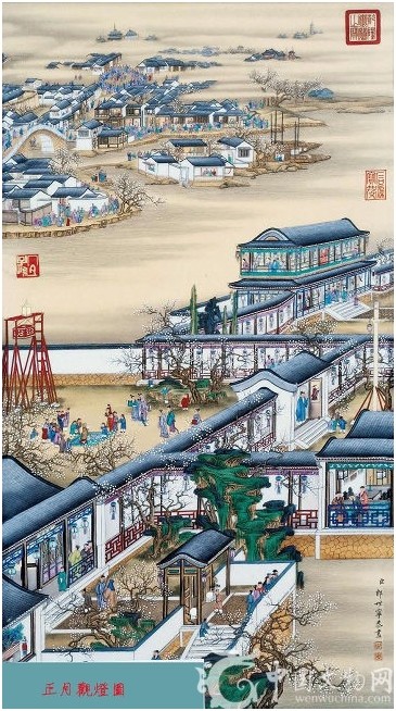 《雍正十二月行乐图》轴,清,绢本,设色,纵188.2cm,横102.2cm。现藏故宫博物院。这是一组表现雍正皇帝日常生活的作品,按春、夏、秋、冬四季12个月的顺序排列,分别为“正月观灯”、“二月踏青”、“三月赏桃”、“四月流觞”、“五月竞舟”、“六月纳凉”、“七月乞巧”、“八月赏月”、“九月赏菊”、“十月画像”、“十一月参禅”和“腊月赏雪”。这12幅行乐图展现了雍正皇帝生活的各个场景,也表现了12个月的不同节令风俗。
