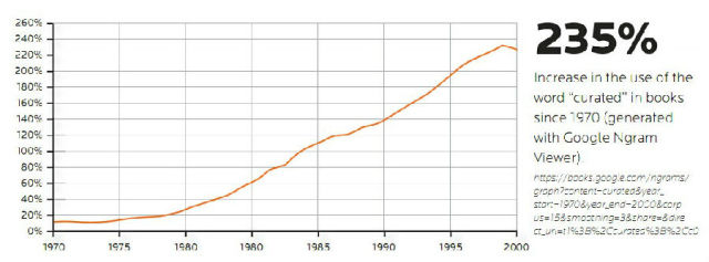 据谷歌词频统计器统计,自1970年以来,美国书籍中使用“curated”(策展)一词的频率提高了235%。