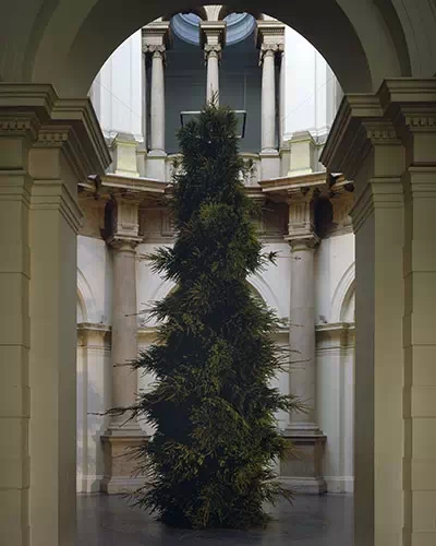 1993年,艺术家Shirazeh Houshiary充分运用了“地心引力”,他设计了一个“悬浮”的圣诞树,树根部分使用了大量的金片装饰。