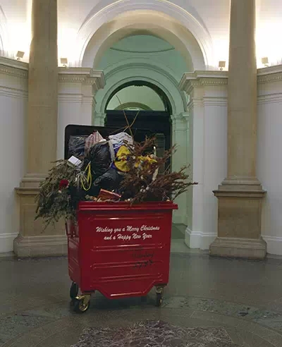 1997年,艺术家Michael Landy在美术馆大厅放了一个垃圾桶,圣诞树被委屈地丢在里面。他认为这是圣诞节的浪费——毕竟圣诞树至多只摆放几周。