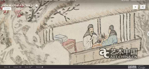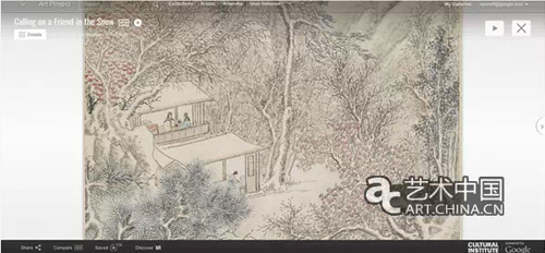 强大的技术是Google文化学院不能不提的一个关键词,此次中国上线的作品中首次使用到了“十亿像素”(Gigapixel)拍摄技术,让艺术作品的每一个动人的细节都可以被清晰的捕捉到。苏州博物馆的上线的山水画《踏雪访友图》就是其中之一,该幅画画的是冬日的自然雪景,表达出画家心目中理想的生活状态。整幅画下笔精确,线条纤细,颜色的运用非常淡雅。在Google文化学院的“十亿像素”下,这幅纵 148 厘米 横37.5厘米的作品中每一个幽静的角落都可以被细致的观察到。