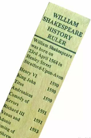 同样地,在莎士比亚的出生地,买一本可以放在口袋里的莎翁作品,虽说很多是古代的英语,很难看懂,但那油墨的清香似乎也散发着原汁原味的意蕴。此外,这个博物馆的莎翁作品年表也非常权威,而且它居然是印在一把普通的未油漆的木尺上。木尺一面是正常的刻度,另外一面则是莎士比亚各部作品问世的年份,看起来一目了然。相信非专业人员一生大概都不需要查看这样的年表,但是手执这样一把尺子,怎么就那么觉得自己有文化呢?