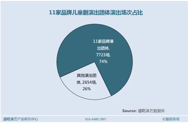 全国74%的演出场次集中在11家演出团体,儿童剧市场向品牌化和专业化发展。随着儿童剧市场的快速发展,诸如中国木偶剧院、北京丑小鸭卡通艺术团、小橙堡儿童艺术团等制作机构开始形成固定的品牌,向全国市场拓展。2014年,11家品牌演出团体演出儿童剧7723场,占比74.4%。