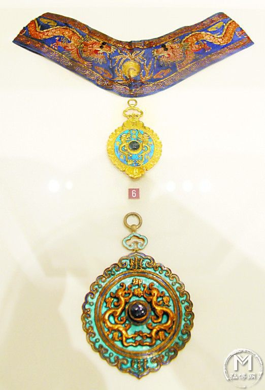 在勋章博物馆里展示的一枚双龙宝星勋章为圆橄榄型,绿底缀有一圈蓝色云纹,中间镶着一颗宝石,旁边环绕两条金龙,勋章盘面上书“御赐双龙宝星”,上下均有满文。这个设计是典型的光绪年间第一版双龙宝星三等第三级勋章,用于授予各国翻译人员。